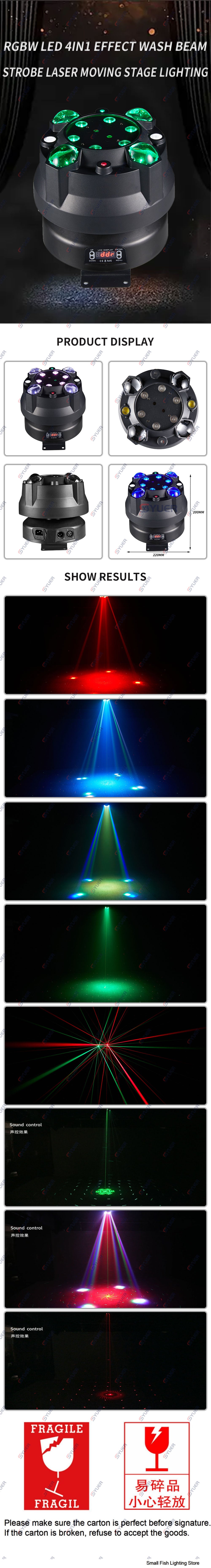 3. Lamp bead parameters: 4 CREE 10W RGBW 4-in-1 lamp beads, 6 3W 3-in-1 dyeing lamp beads, 2 10W white light strobes, 2 100MW red lasers, 2 50MW green lasers